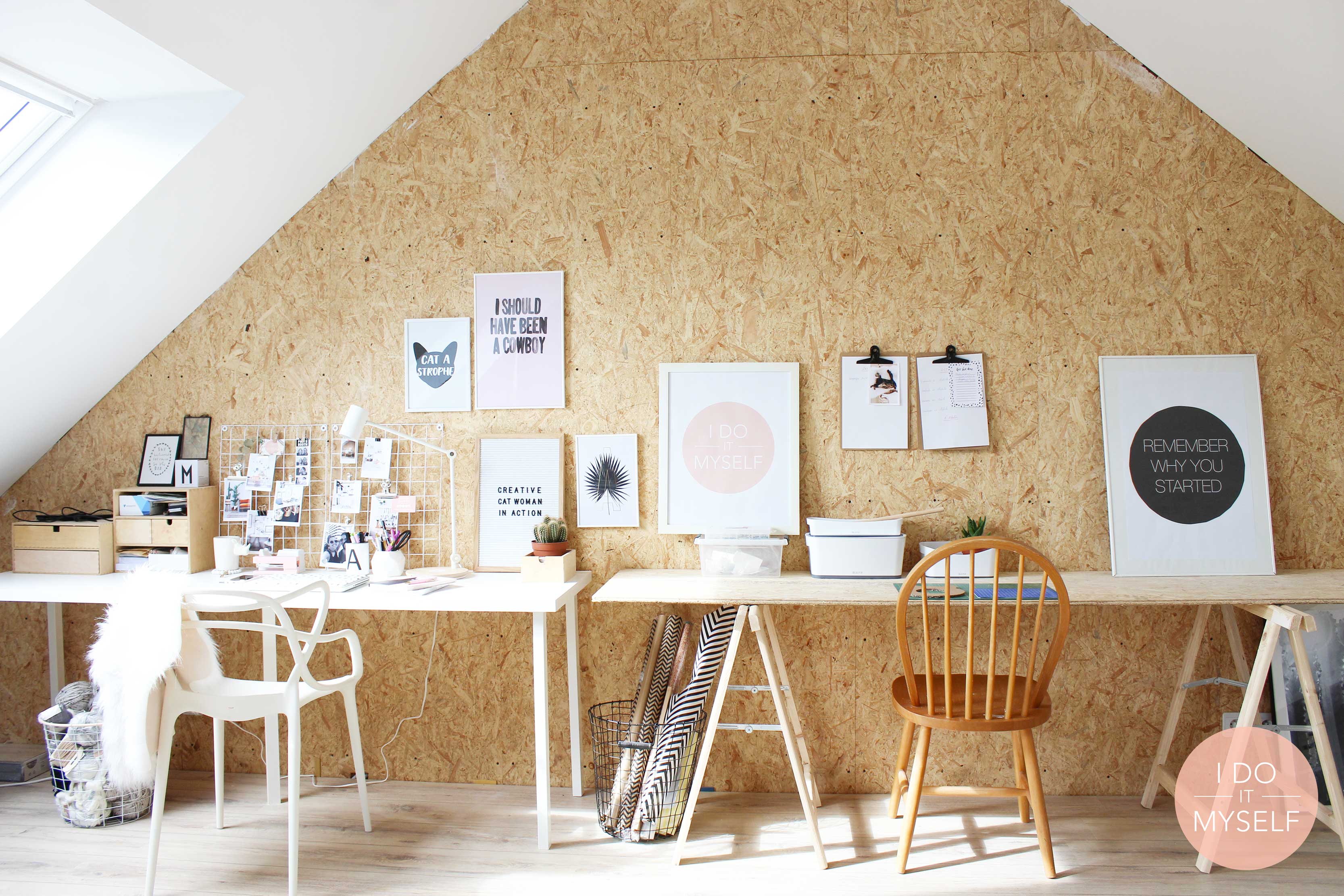 Devant le grand mur en OSB j’ai placé mon bureau et mon plan de travail DIY.