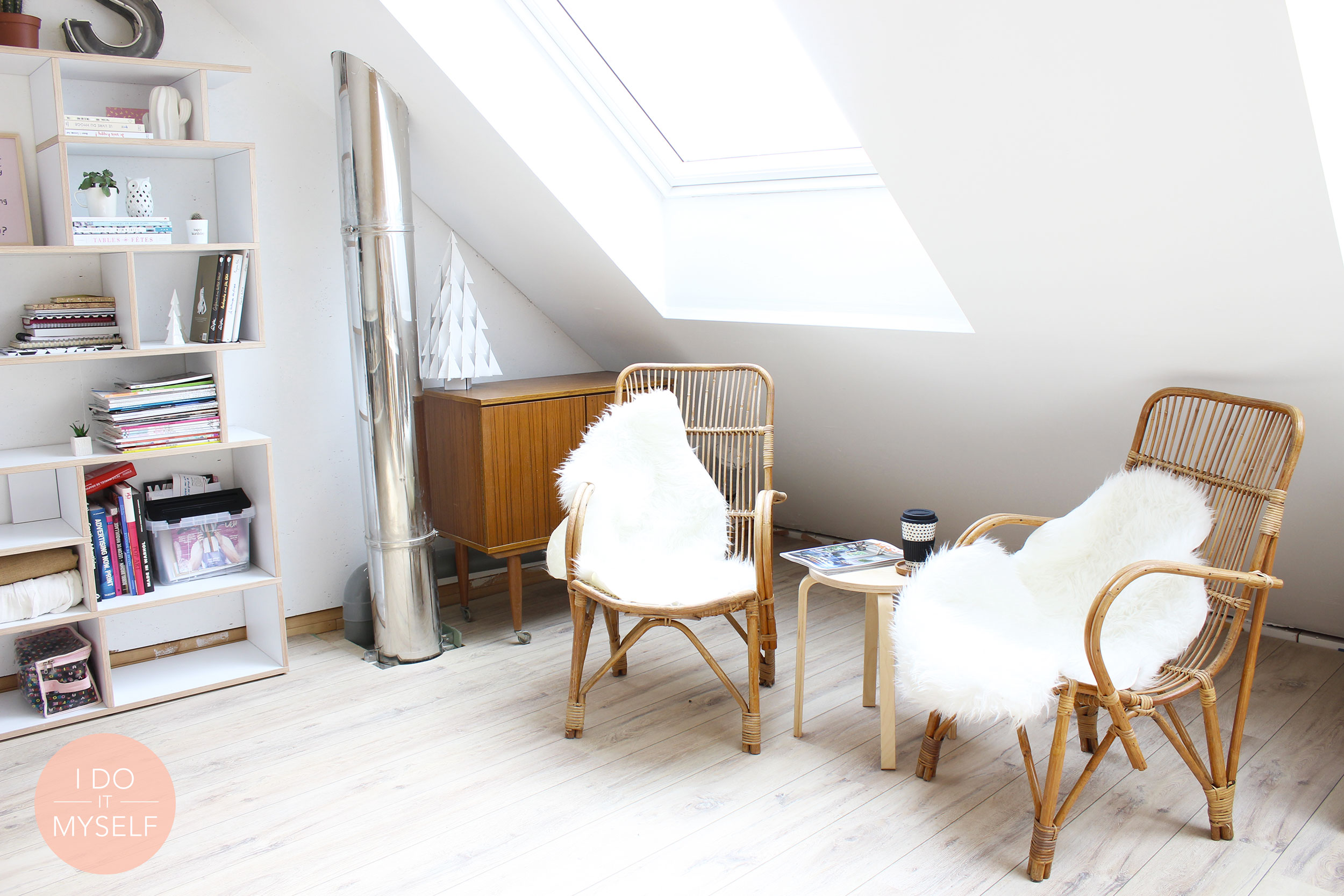 En dessous des Vélux, comme le toit est en pente et que je ne peux pas y mettre grand chose j’ai fait un petit coin de lecture cozy. Je m’y installe dans mes chaises en rotin pour y lire ou pour chercher des inspirations dans mes magazines de déco préférés. Une des chaises est souvent occupée par un de mes chats!
