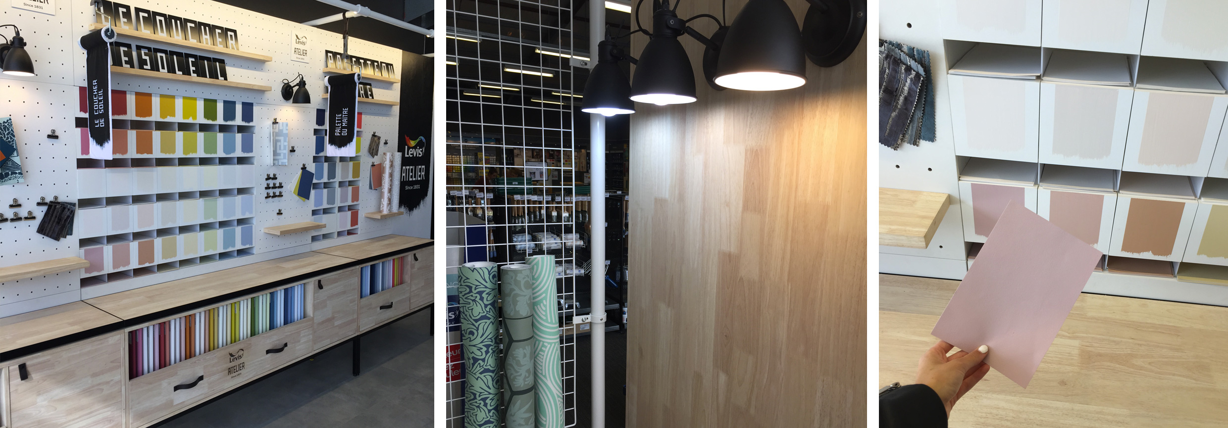 Le concept Levis Atelier est tout nouveau et pour l’instant il n’est disponible que chez PAINT HOUSE à Wavre (Belgique). Il propose une nouvelle gamme du nom » Atelier » avec différentes sortes de peintures et une multitude de coloris mais également tout un espace de présentation hyper pratique. On y retrouve des grands carrées de bois peints avec les différentes couleurs qu’on peut regarder sous différentes lumières et assortir avec plusieurs sortes de sol. Ce qui nous donne une vrai idée de l’effet qu’aura la peinture chez soi. Il y a aussi moyen d’emporter des petits papiers qui sont réellement peints avec la couleur. Ca change des nuanciers qu’on trouve habituellement!
