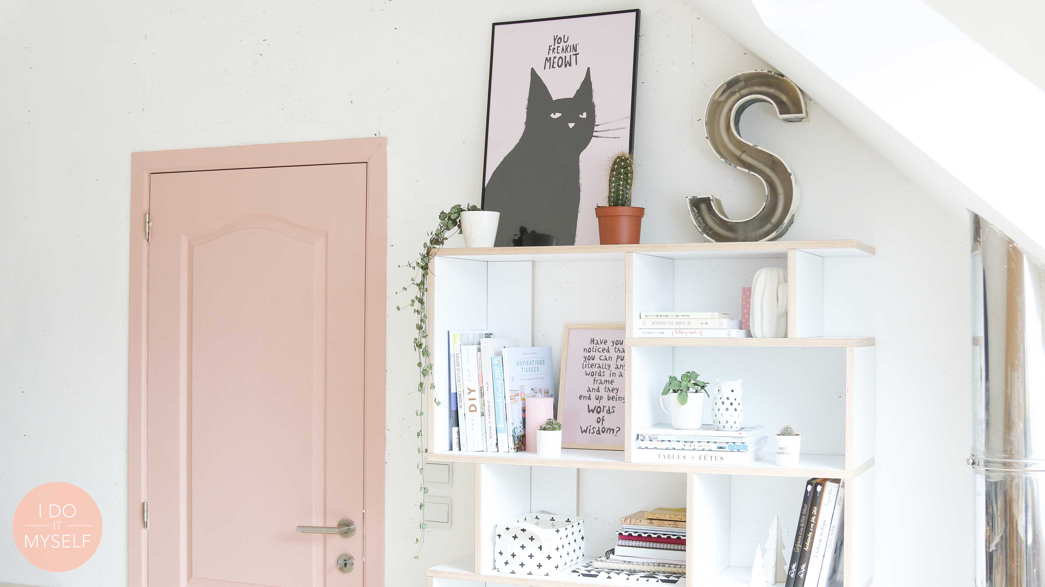A coté de la porte j’ai placé mon étagère design que j’adore de chez Tylko (je vous en avais parlé dans un précédent article à relire ici). J’y ai rangé mes livres de déco, de DIY et d’inspirations préférées ainsi que quelques objets de déco et de plantes.