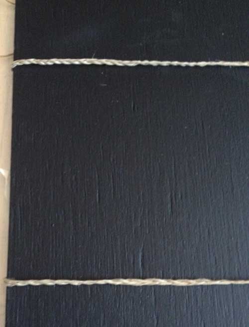 Découpez vos cordes à la mesure et présentez-les sur la planche. Attention laissez un espace suffisant au-dessus du tableau pour écrire un texte tel « Joyeux Noel ».