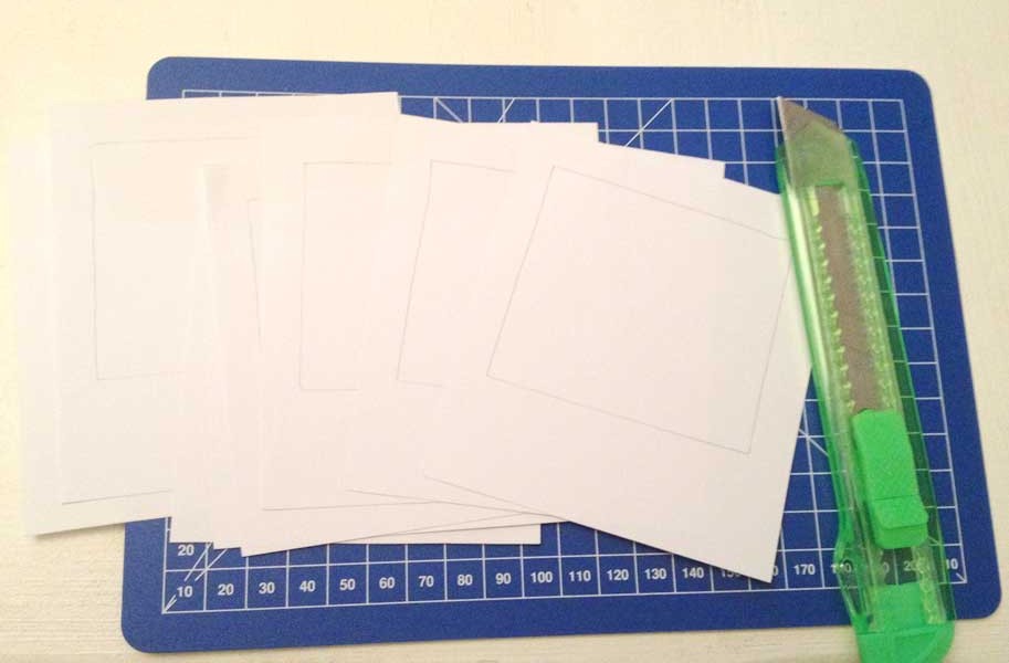 Découpez vos photos au format souhaité. Découpez un cadre blanc dans un papier carton, découpez la fenêtre du Polaroïd.