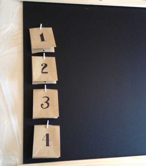 J’ai choisi une photo pour mettre avec les cadeaux dans chaque sachet. Une fois le sachet du jour ouvert, on pend la photo à la place de celui ci, et le tableau servira de cadre photo.