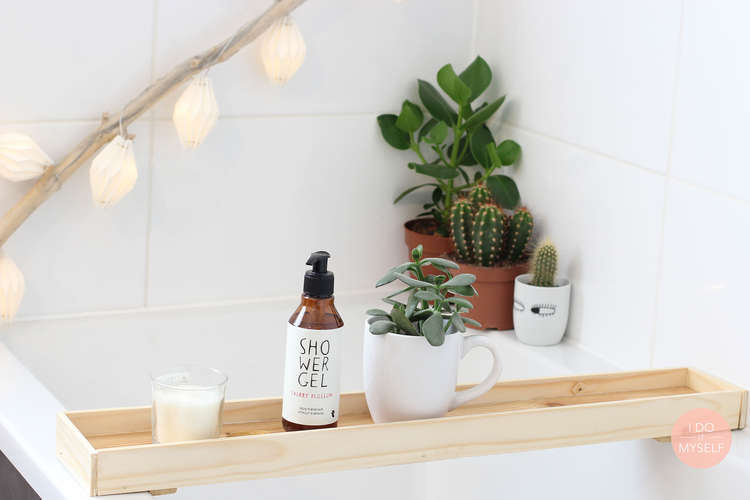 Dès que le vernis est sec, vous pouvez disposer votre planche sur le rebord de votre baignoire et la décorer de jolis accessoires de salle de bain!