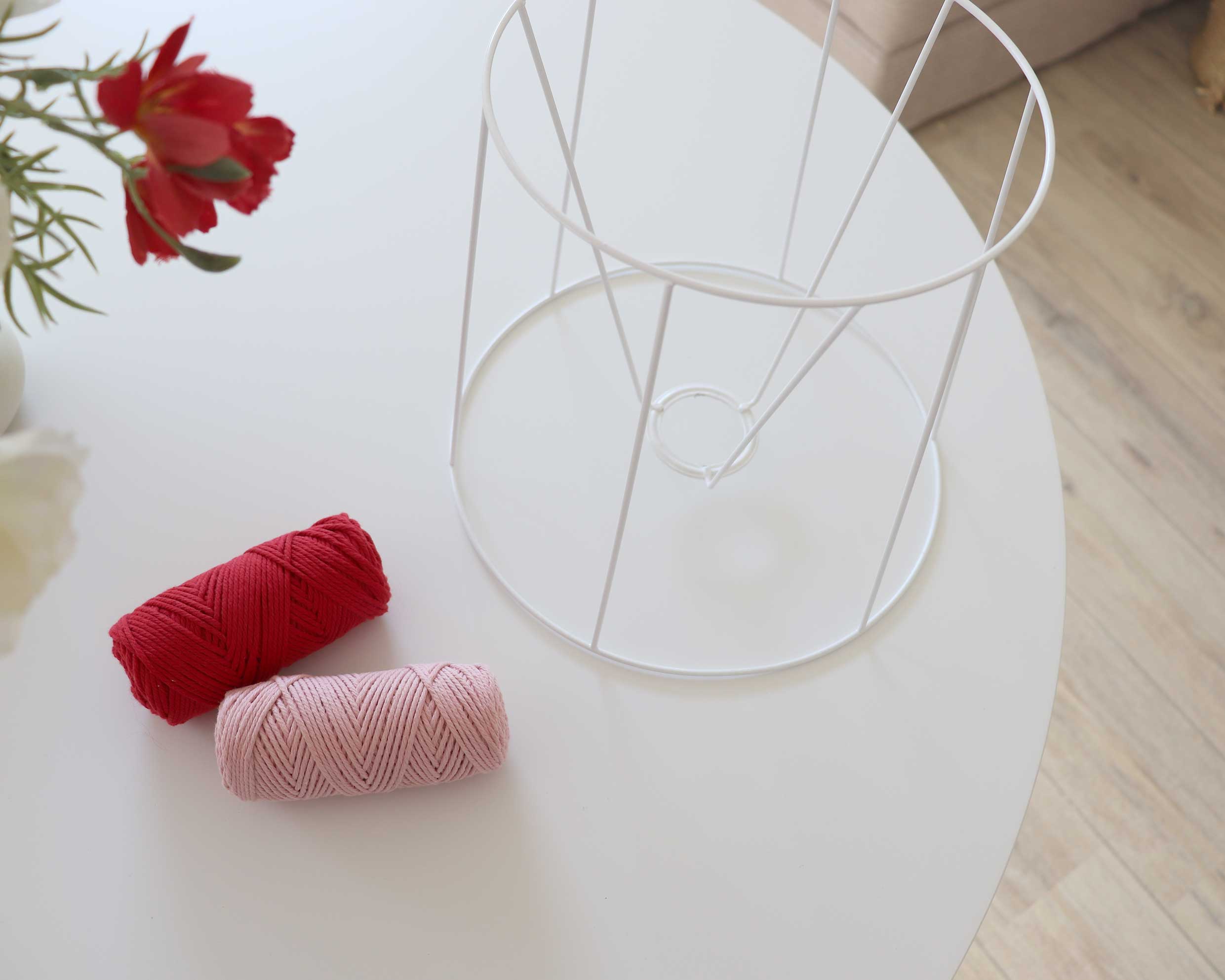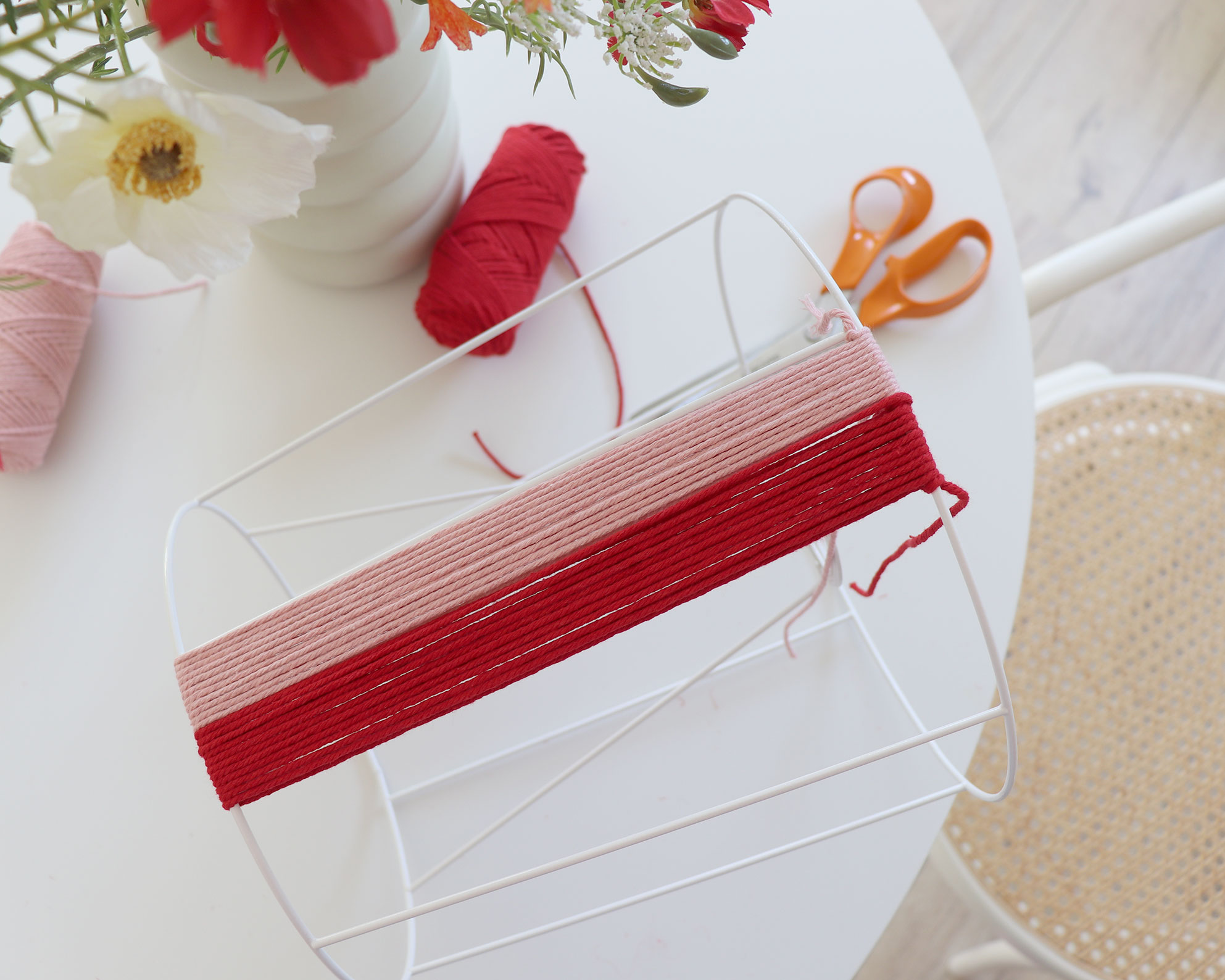 J’ai choisi du fil de coton épais rose et rouge. J’ai commencé par nouer le fil rouge à la base, puis je l’ai enroulé autour de la carcasse en serrant bien. J’ai alterné 11 tours de rouge, puis 11 de rose, jusqu’à recouvrir entièrement la structure.