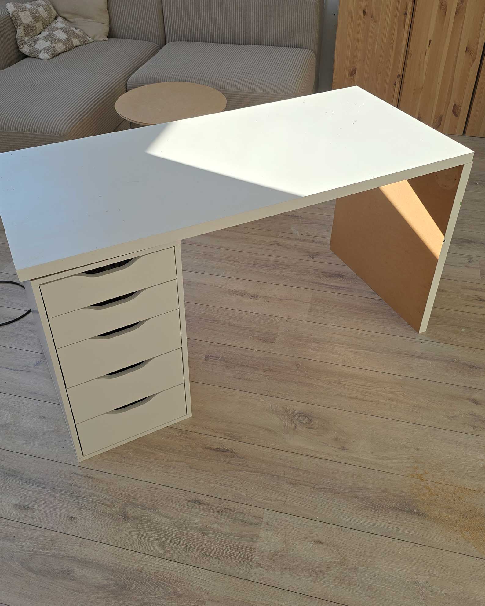 J’avais préalablement retiré les pieds du bureau, qui ne me serviront plus. Je pose la planche fraîchement découpée sur mon petit meuble à tiroirs, et de l’autre côté, je glisse la partie de planche que je viens de découper.