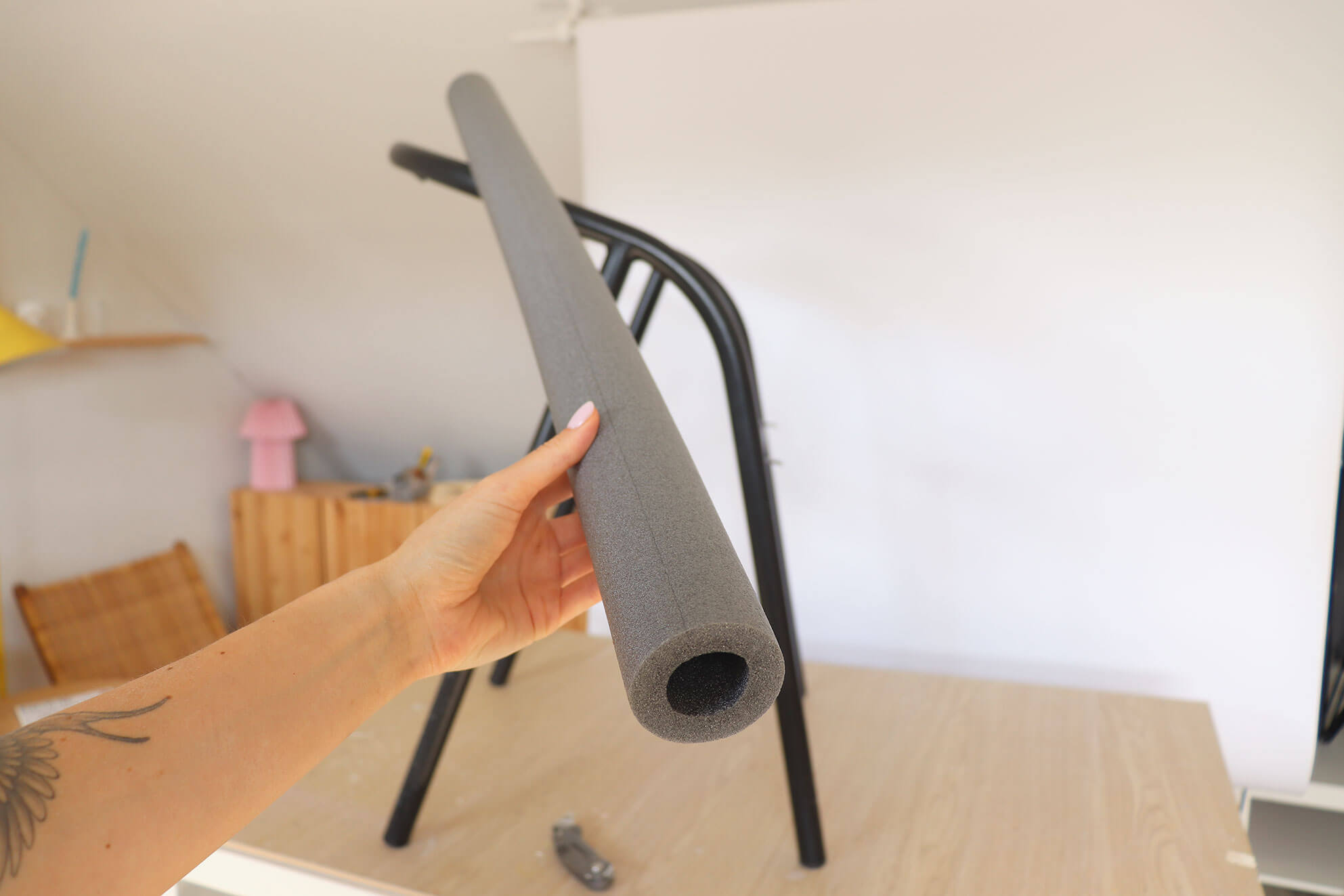 Pour donner un peu plus d’épaisseur et de confort à ma chaise, j’ai choisi de la recouvrir de tubes en mousse. J’ai d’abord pensé prendre des « frites de piscine », mais celles repérées à la piscine dans laquelle je vais nager n’avaient pas de trous au milieu. Je me suis donc rabattue sur des tubes d’isolation en mousse pour les tuyaux. Ce qui est top, c’est qu’ils sont creux et déjà prédécoupés sur toute la longueur, ce qui va grandement me faciliter la tâche.