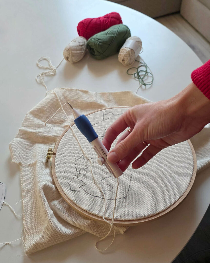 Le matériel nécessaire pour réaliser des sous-tasses de Noël en punch needle
