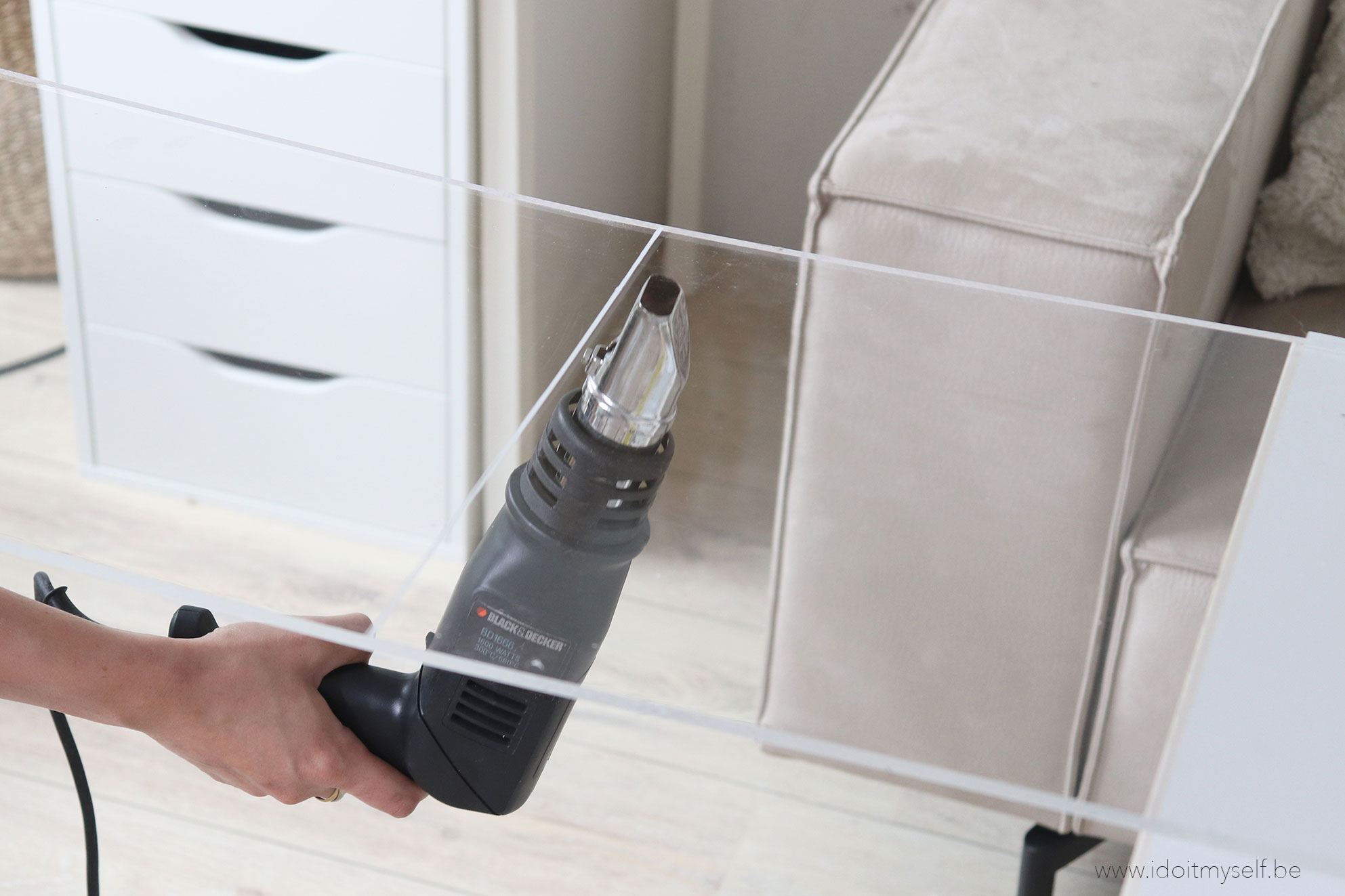 Branchez le fer à chauffer, et venez chauffer la plaque de plexi à l’endroit de votre ligne. Le fer ne doit pas toucher le plexi (sinon vous allez le griffer) mais il doit être assez proche. Si comme moi, vous avez choisi un plexi assez épais, il vous faudra au moins 5 bonnes minutes de chaleur avant de pouvoir plier le plexi.