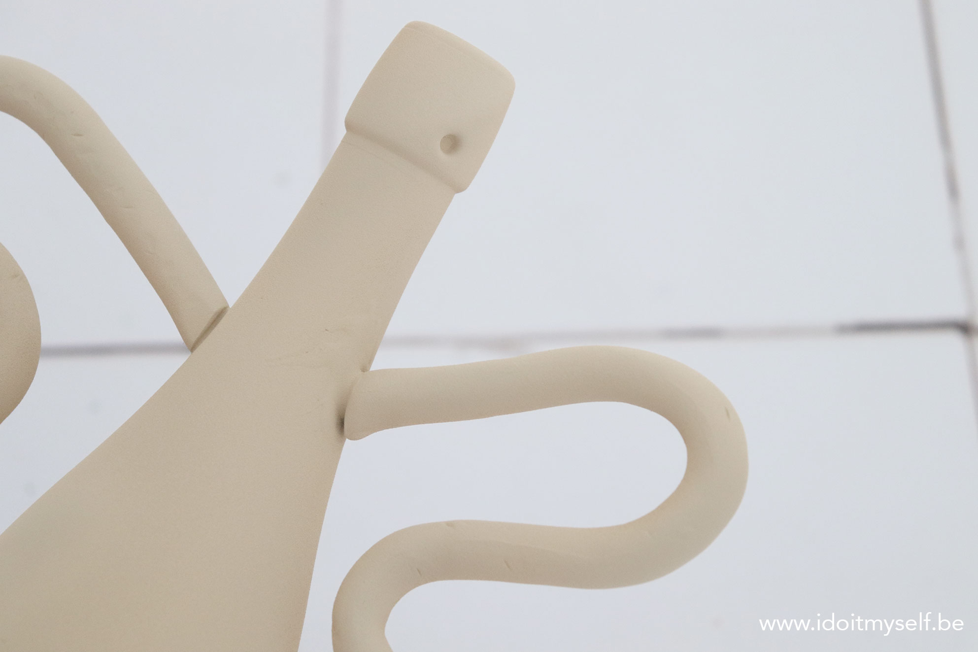 Préparez le mélange de colle epoxy (attention de bien aérer la pièce, protégez-vous les mains et mettez un masque si nécessaire). Collez d’abord une anse. Maintenez-la le temps que la colle prenne, c’est assez rapide. Laissez ensuite sécher la colle pendant +- 1H avant de faire la même chose avec la seconde anse.