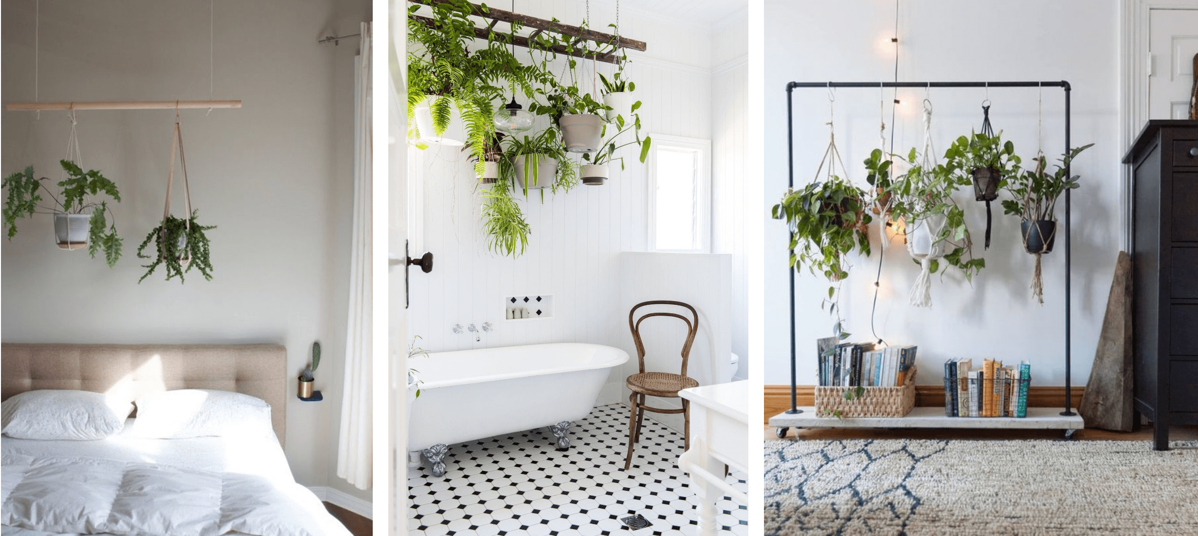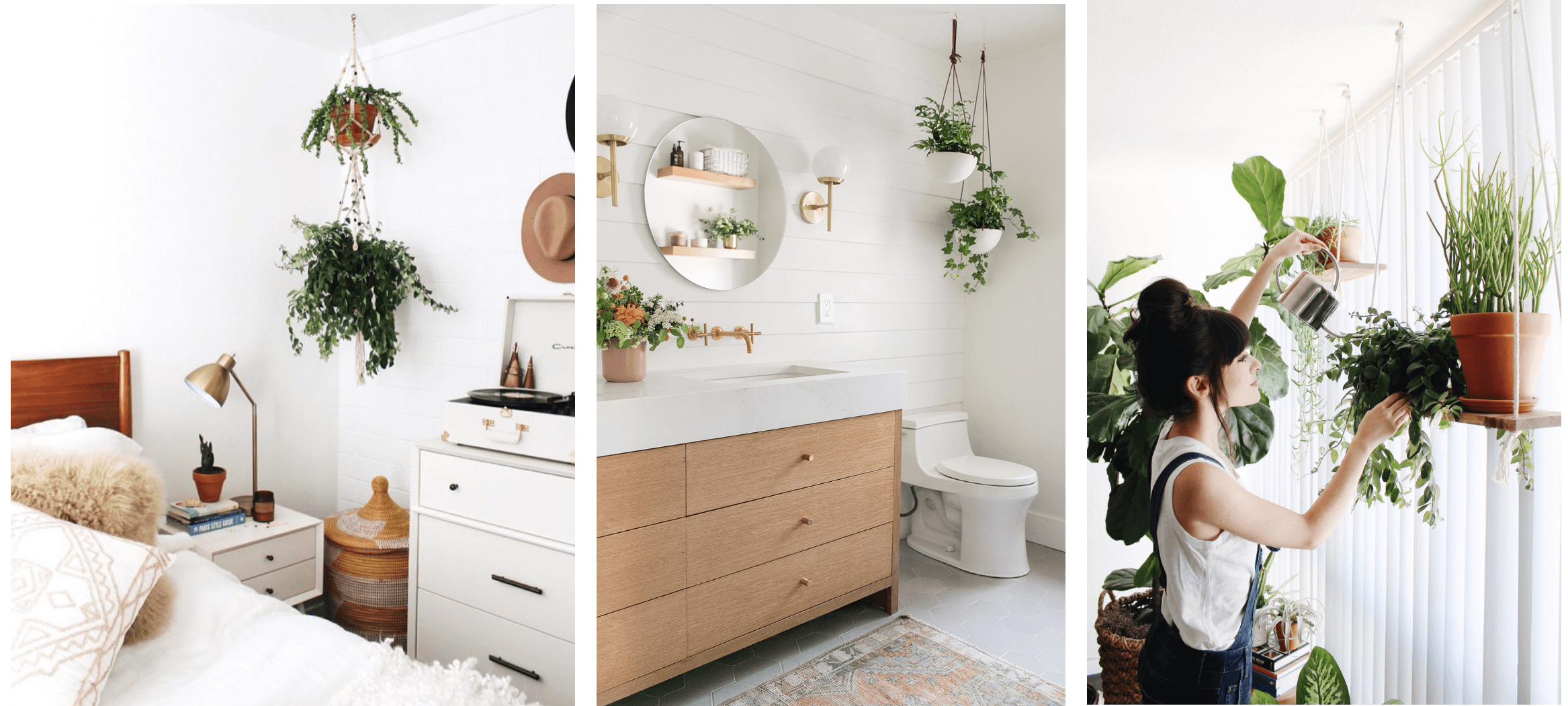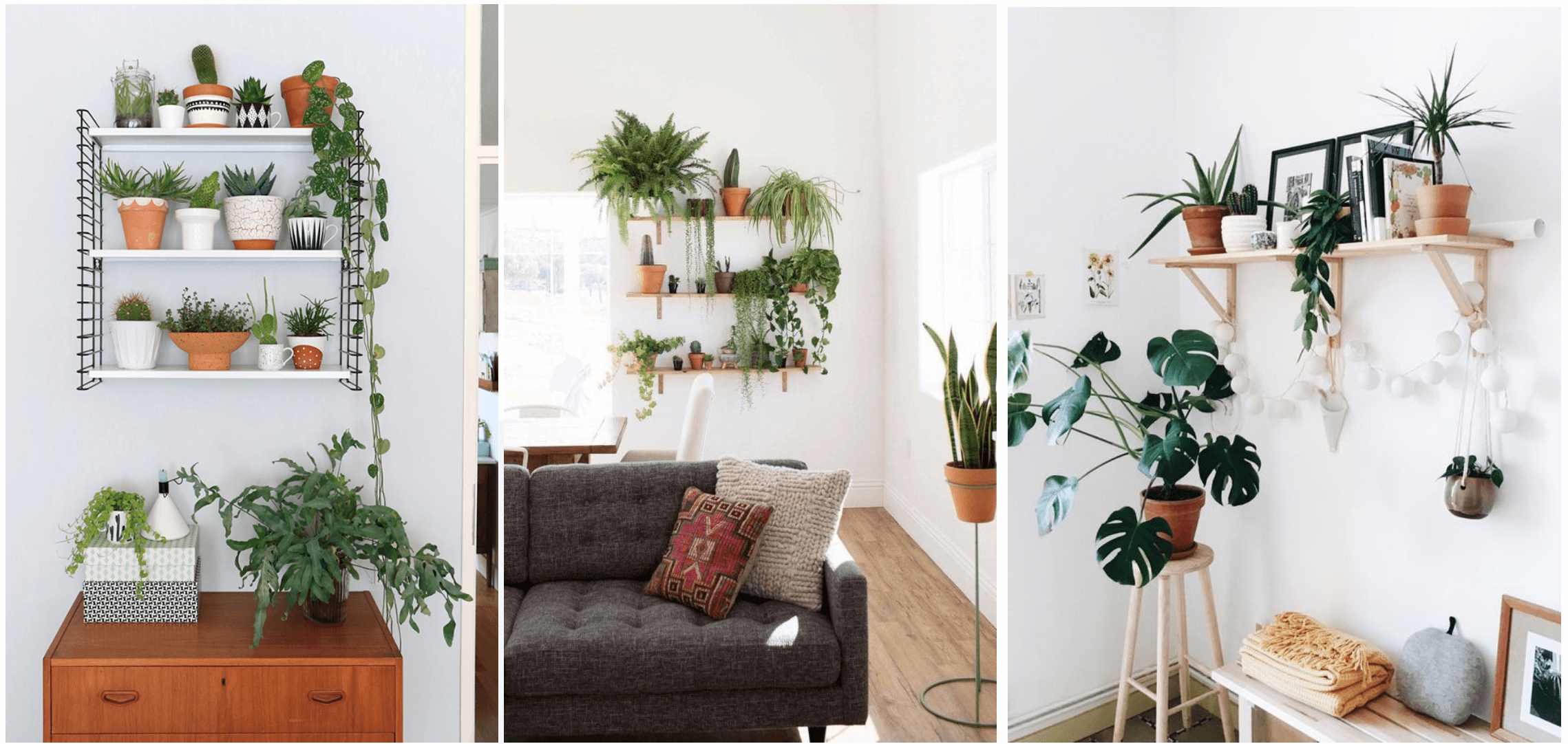 J’aime l’idée d’accrocher les plantes au plafond, avec des jolies suspensions ! Vous pouvez même les réaliser vous même en macramé, les customiser,… Cela permet de décorer votre pièce si vous n’avez pas l’occasion d’y consacrer un meuble. J’ai aussi publié il y a quelque temps un tutoriel pour réaliser vous-même une jolie suspension. Vous pouvez le lire en cliquant ici.