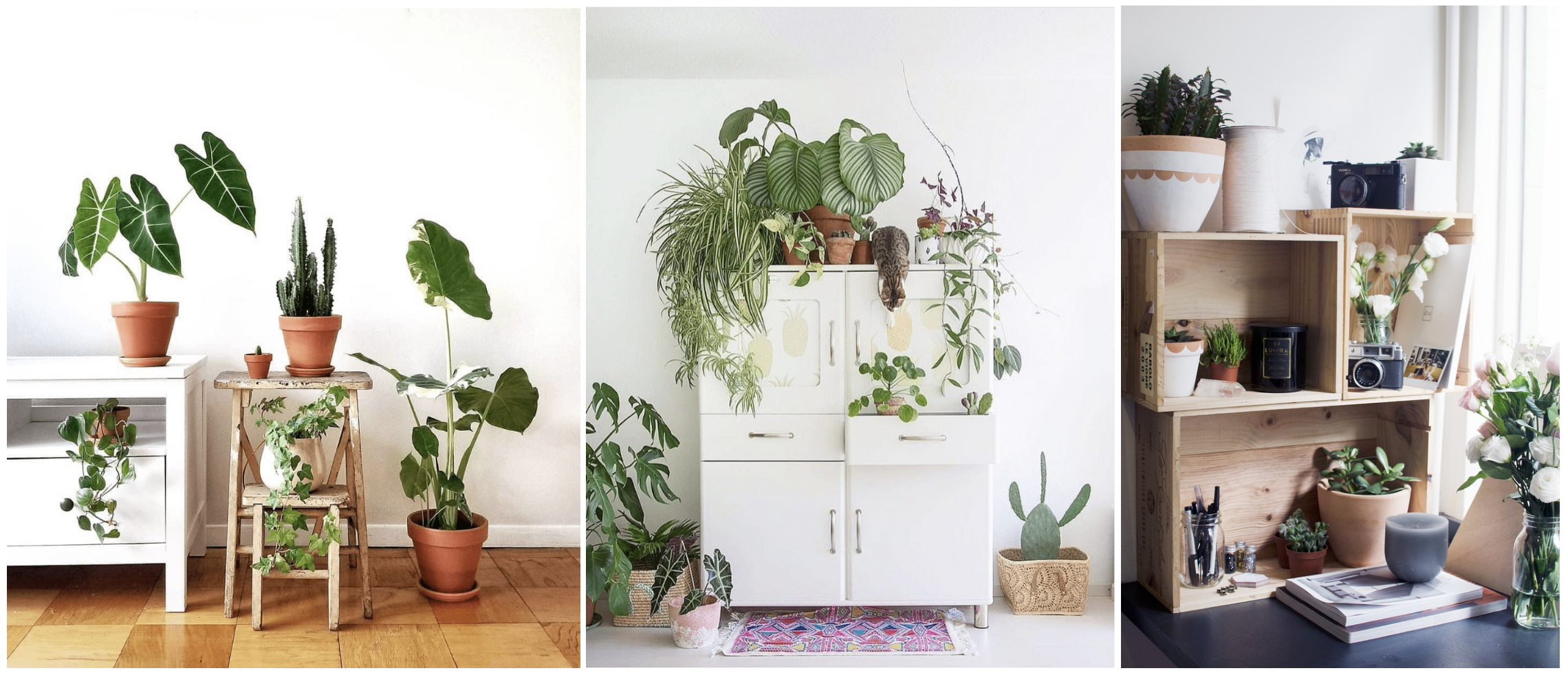 J’aime l’idée d’ajouter un petit meuble pour pouvoir y placer des plantes. Vous pouvez utiliser des petits tabourets chinés comme présentoir à plantes. Cela permet d’en mettre plusieurs sur un espace plus petit. Vous pouvez y placer des plantes tombantes, mais également des grandes plantes tout en apportant un peu de volume à votre déco.