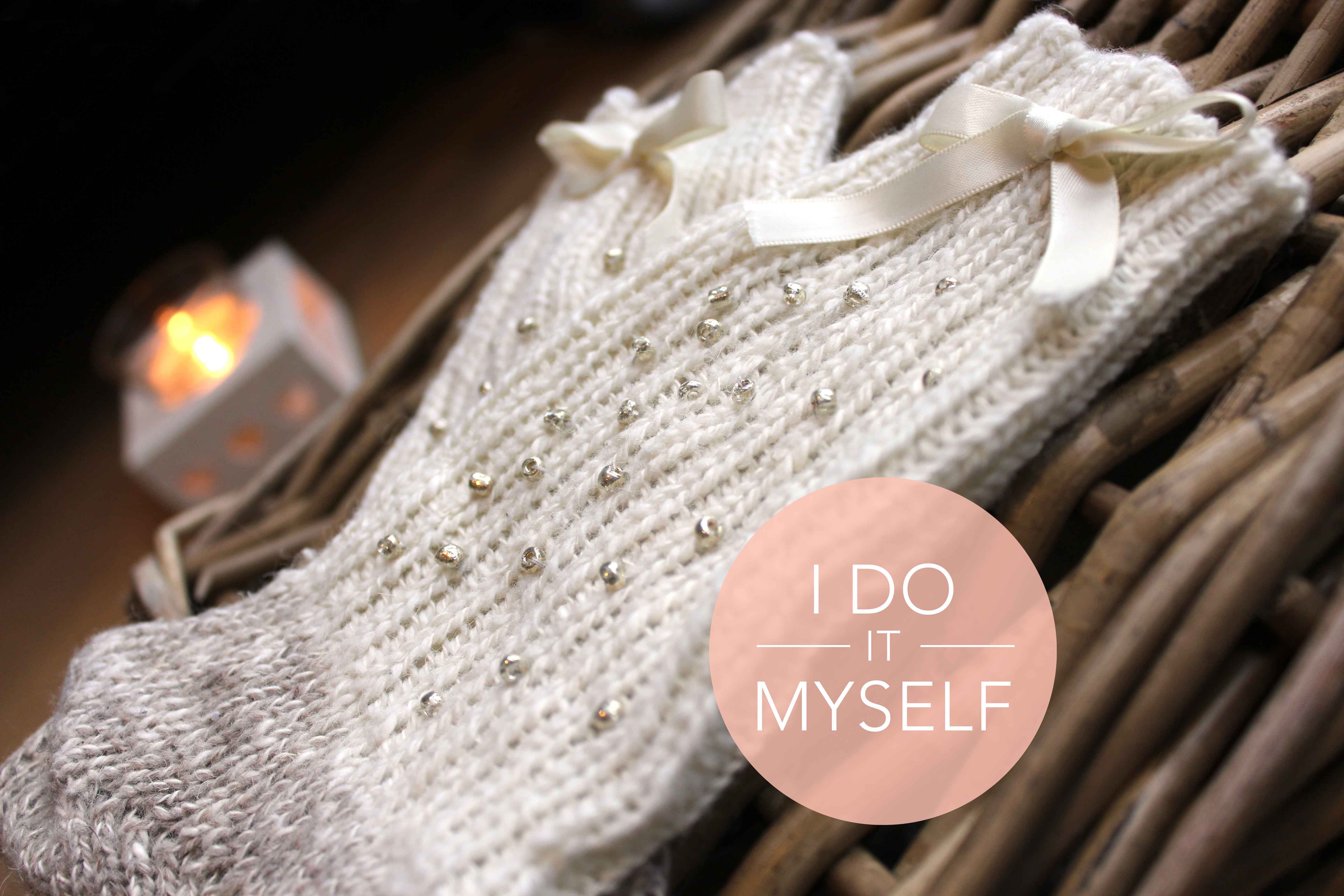 J’ai choisi de les coudre vers le haut de la chaussettes pour que ça ne gène pas si on met des chaussures. J’ai également choisi de disposer mes perles sur la partie externe de la chaussette afin qu’elles soient visibles.