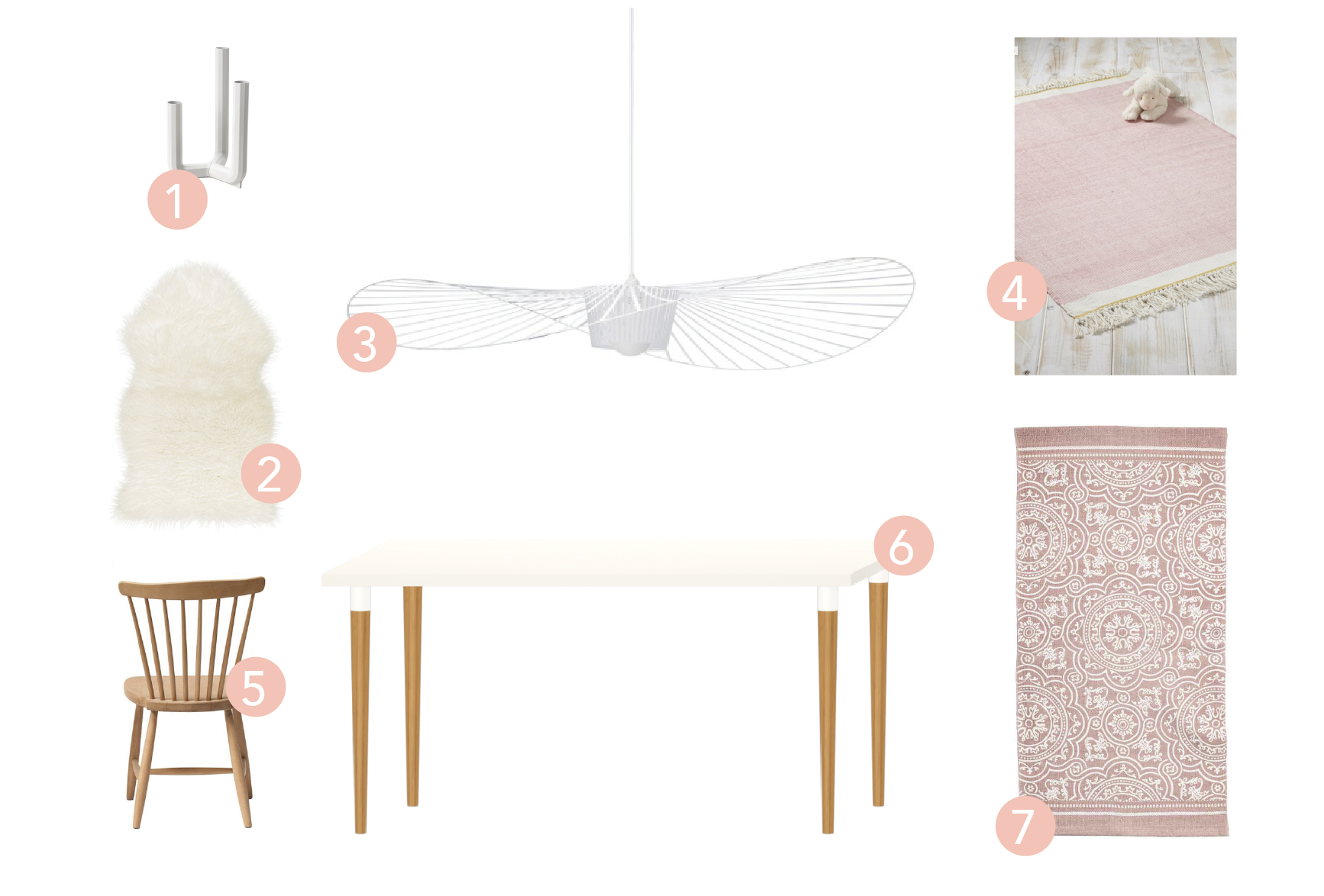 Je voudrais trouver quelques tapis de la même teinte pour créer un mix and match sous la table. Et faire le même principe avec les chaises chinées tout en bois ou bien blanches. J’y ajouterais une fausse fourrure sur certaines pour le côté chaleureux.